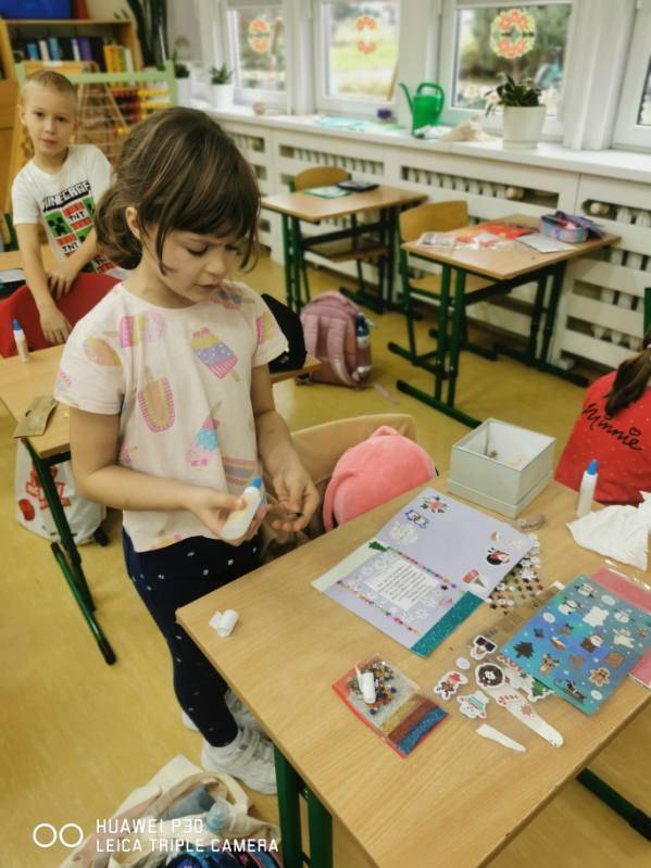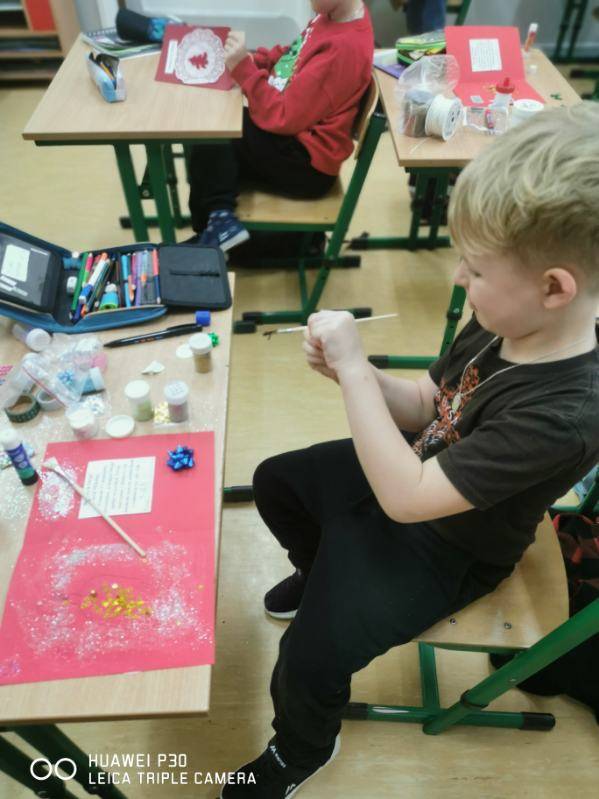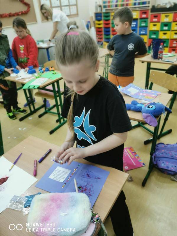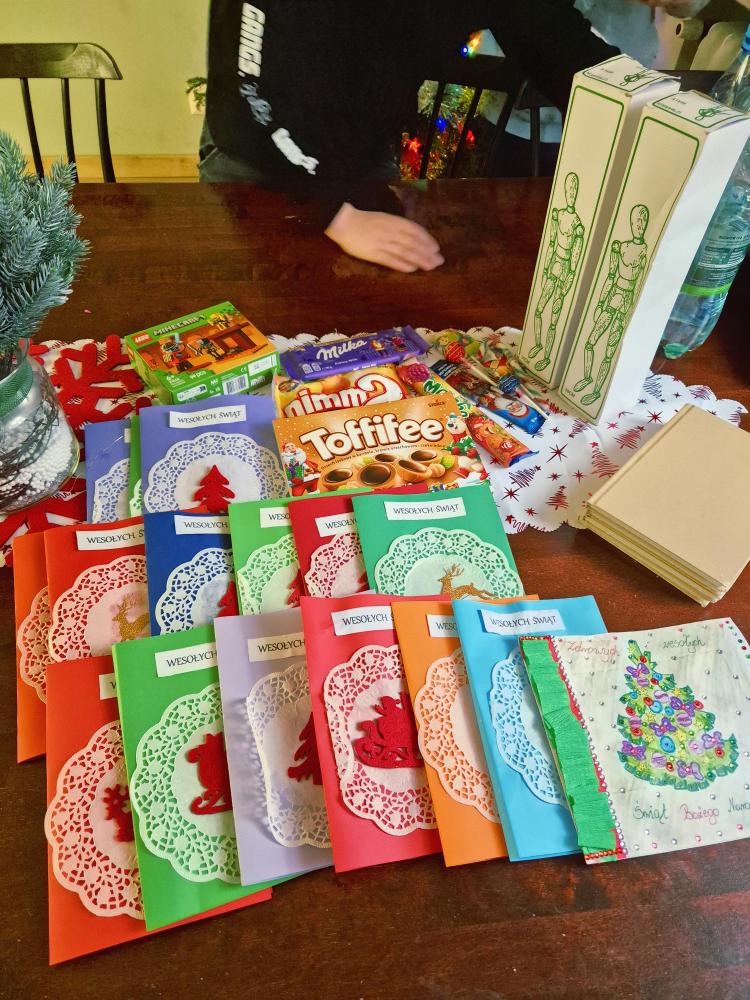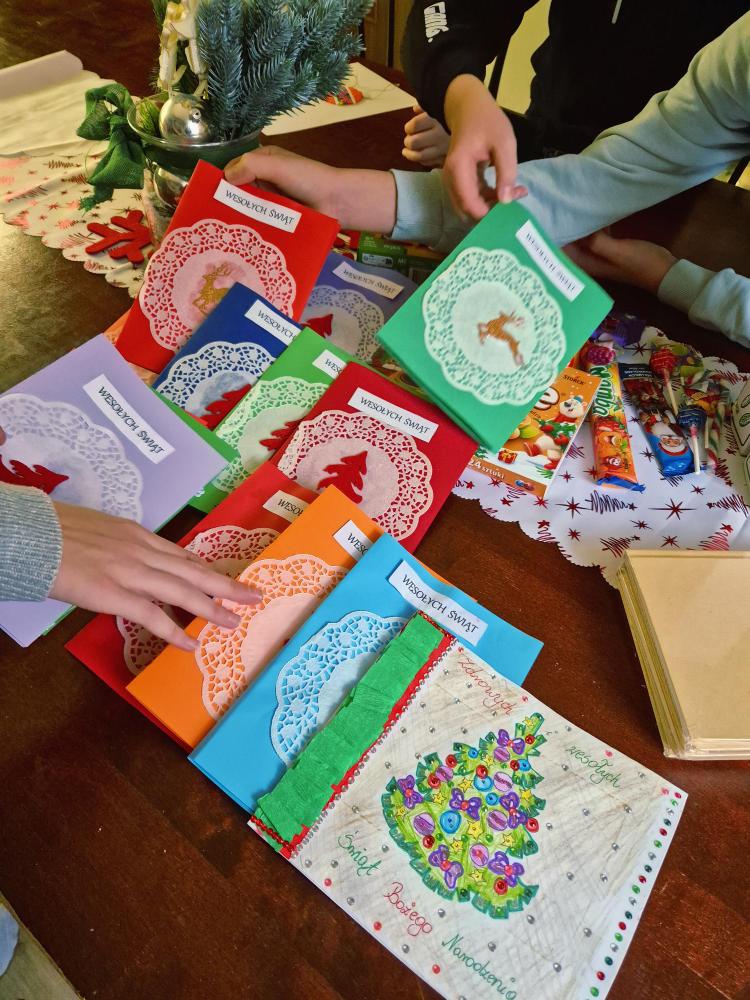 Dnia 12 grudnia 2025r. dzieci z klasy I a wzięły udział w akcji charytatywnej „Uśmiech w kopercie”. Nasi uczniowie samodzielnie wykonali kartki świąteczne, które przed samymi Świętami Bożego Narodzenia zostały dostarczone wraz z drobnymi upominkami dzieciom z Domu Dziecka „Anielisko” w Warszawie.
