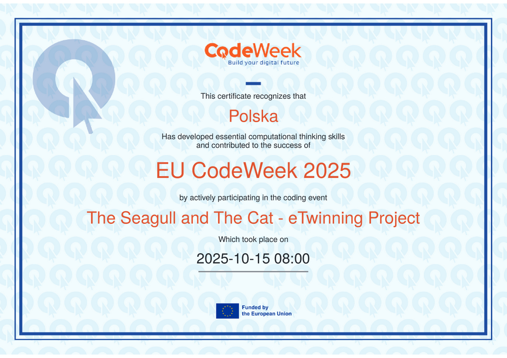 W dniach 11–16 października 2025 r. odbywał się Europejski Tydzień Kodowania (Code Week 2025) – inicjatywa promująca naukę programowania i rozwijania kompetencji cyfrowych wśród dzieci i młodzieży w całej Europie. Jakub Lulek, uczeń klasy 4b, wziął udział w tym wydarzeniu, reprezentując naszą szkołę w ramach międzynarodowego projektu eTwinning pt. „The Seagull and The Cat” inspirowanego książką Luisa Sepúlvedy.