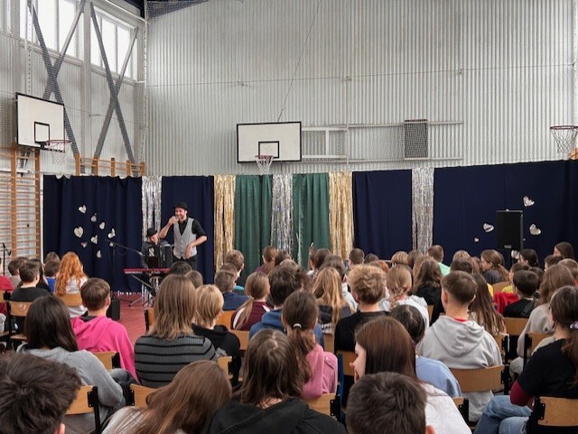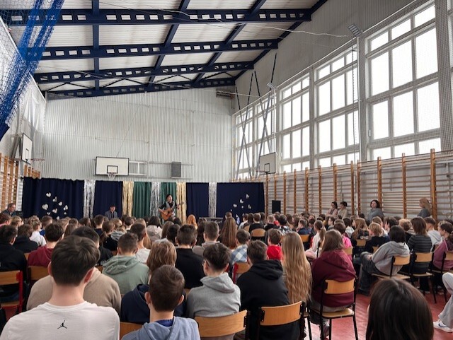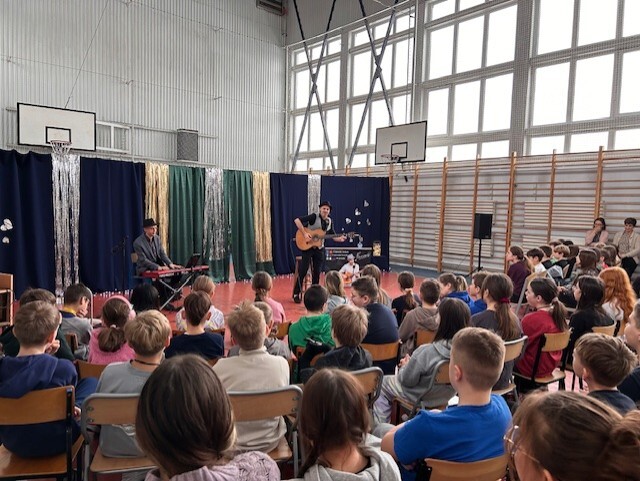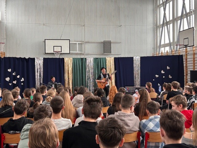Kolędy francuskie i polskie po francusku, zwyczaje bożonarodzeniowe, świąteczne potrawy, dużo dobrej muzyki okraszonej anegdotami i dobrym humorem, to wszystko dzięki François, francuskiemu muzykowi, który odwiedził mury naszej szkoły w ten mroźny, zimowy piątek. Noworoczny koncert muzyki francuskiej wprowadził nas w dobry nastrój, rozbudził ciekawość i pozwolił oderwać się od codzienności. Młodzież chętnie zadawała pytania, włączyła się we wspólne kolędowanie i dostała zaproszenie na spotkanie na Instagramie już we wtorek. „To było bardzo ciekawe doświadczenie”, „To najlepszy koncert na jakim byłam” - te i inne opinie dało się słyszeć po zakończonym występie. Nie mówimy więc sobie „Adieu” lecz „Au revoir”!