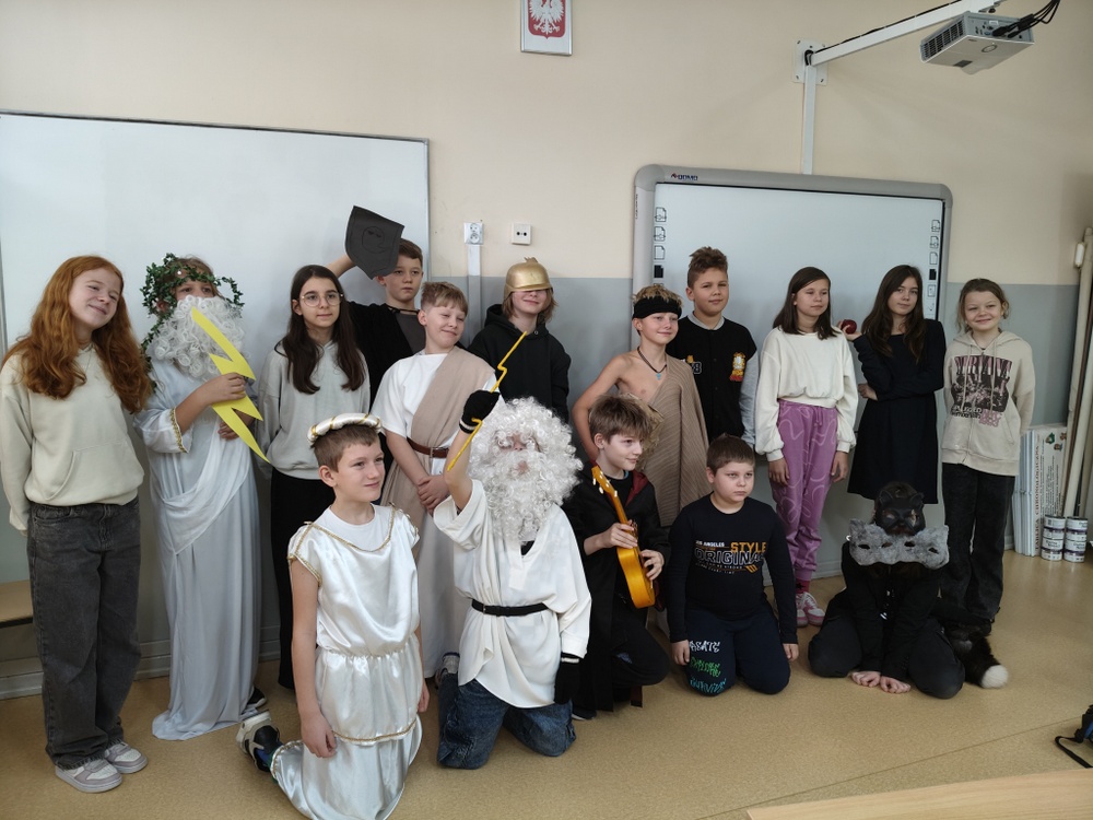Uczniowie klasy 5b przygotowali wyjątkową prezentację mitów greckich, która stała się prawdziwą podróżą do świata starożytnych bogów i herosów. Podczas występu młodzi artyści zaprezentowali wybrane mity, wcielając się w role znanych postaci.