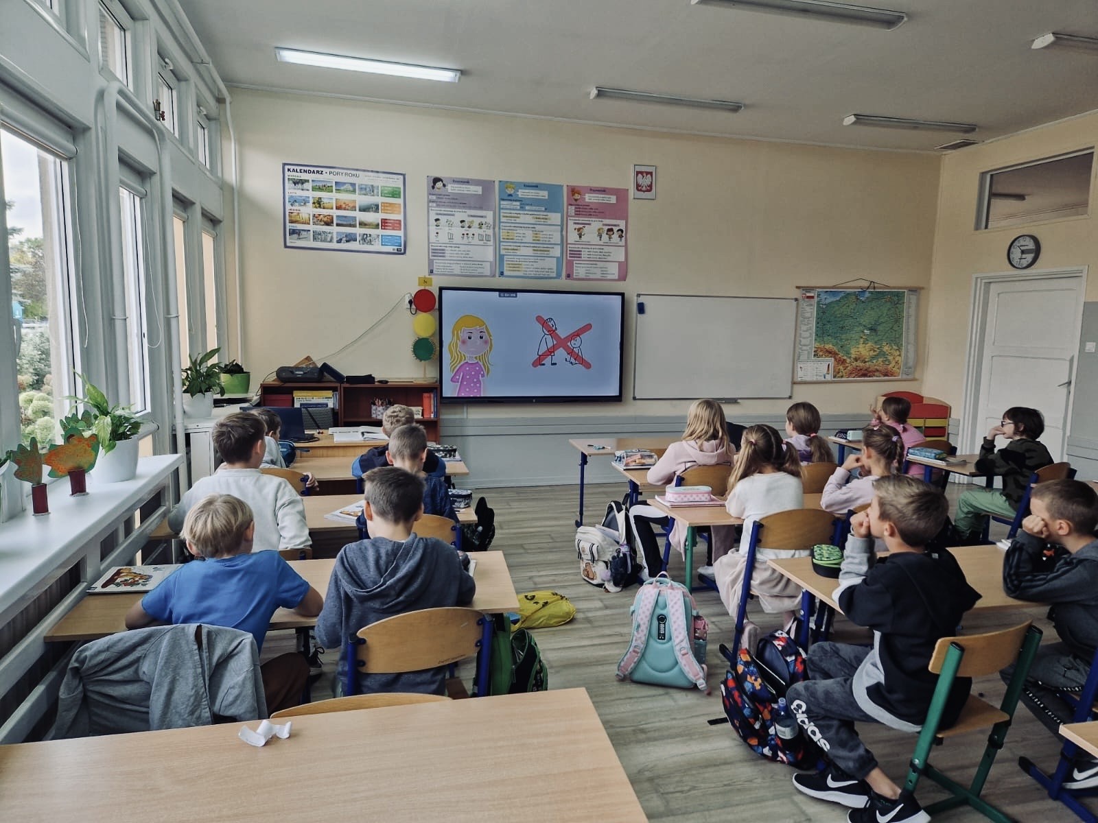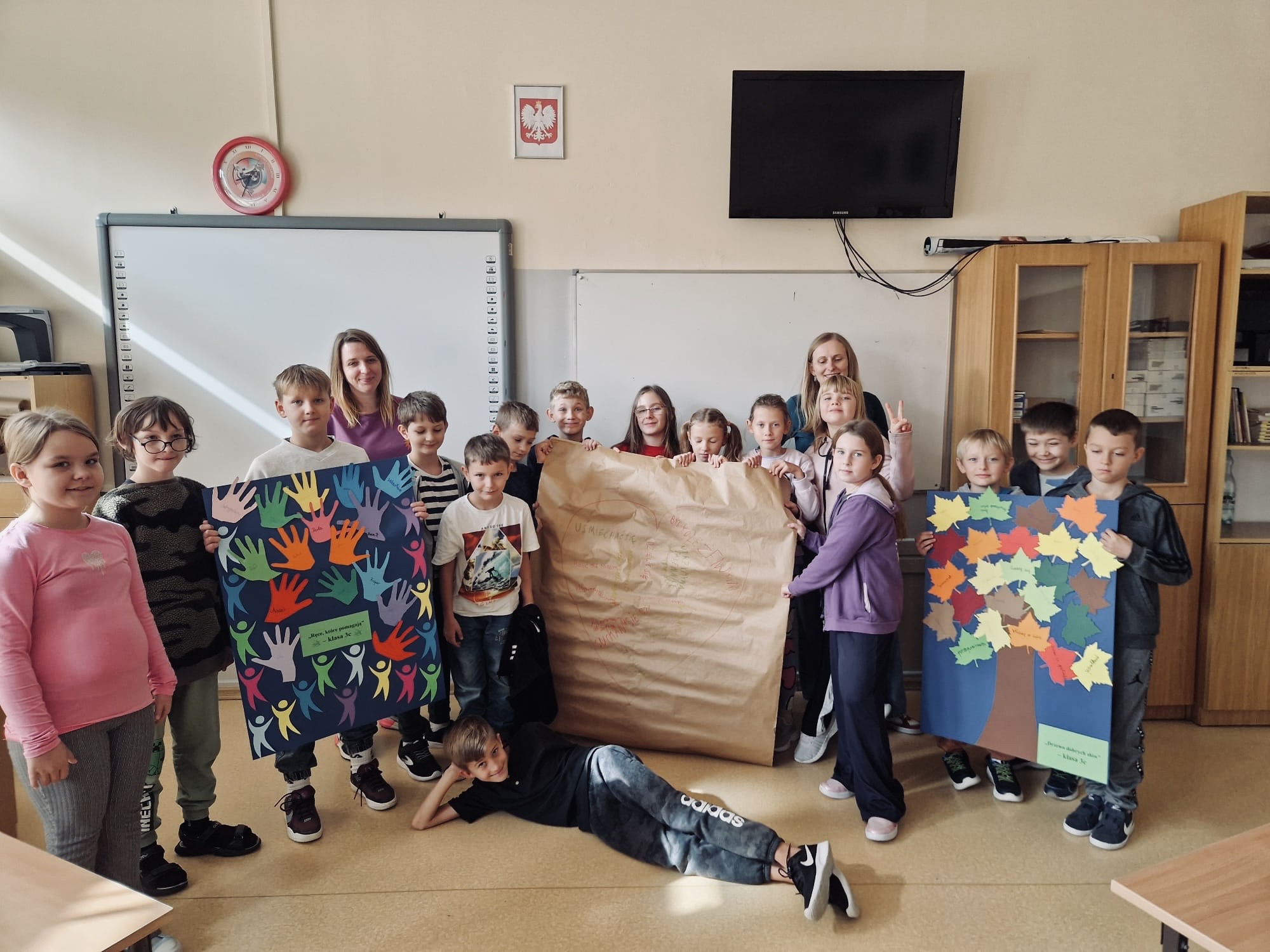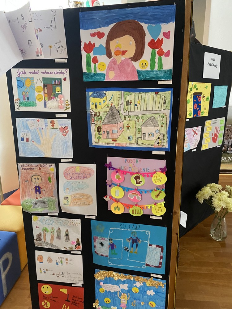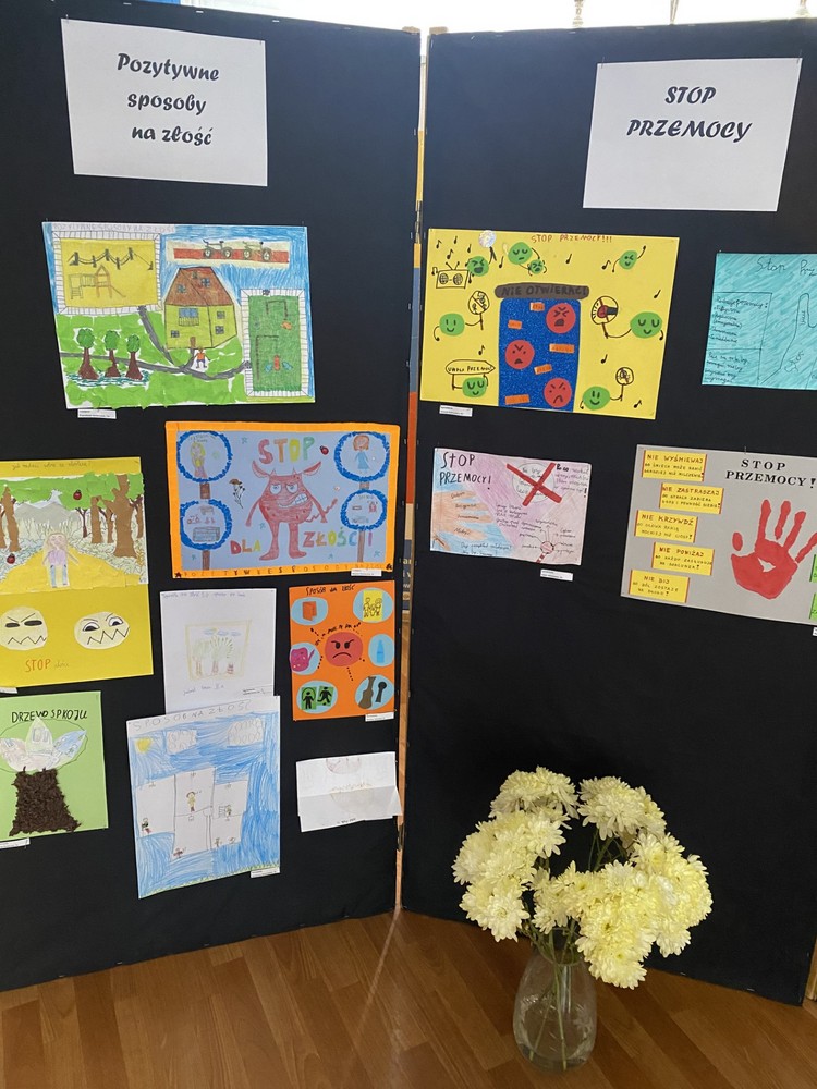 W klasach 1–3 odbyły się warsztaty pt. „Nasza paczka bez przemocy”. Dzieci rozmawiały o tym, co zrobić, gdy zauważą niewłaściwe zachowania u innych, wysłuchały opowiadania o Tymku i wspólnie analizowały jego sytuację. Zwieńczeniem spotkań były twórcze prace grupowe – „Drzewo dobrych słów” oraz „Ręce, które pomagają”, które przypominają, jak wielką moc mają życzliwe słowa i drobne gesty.