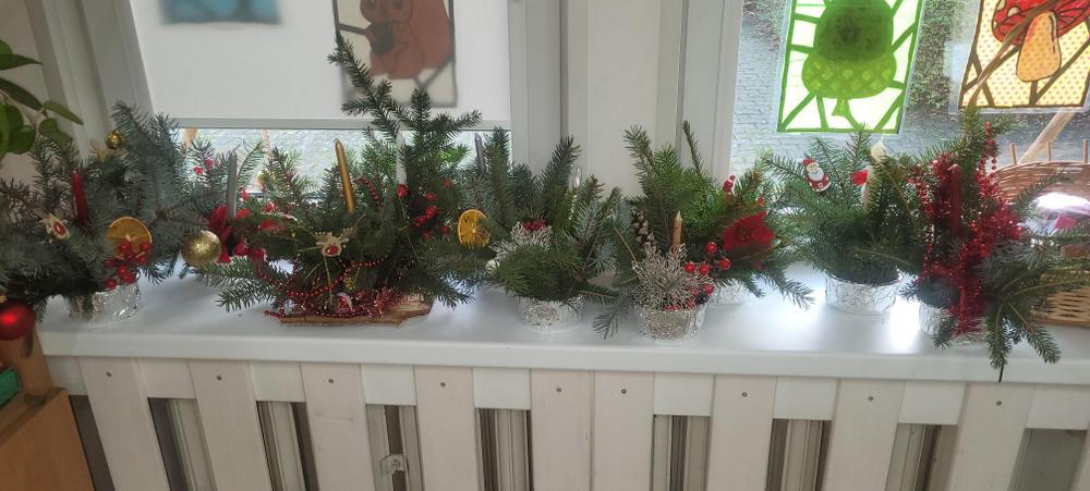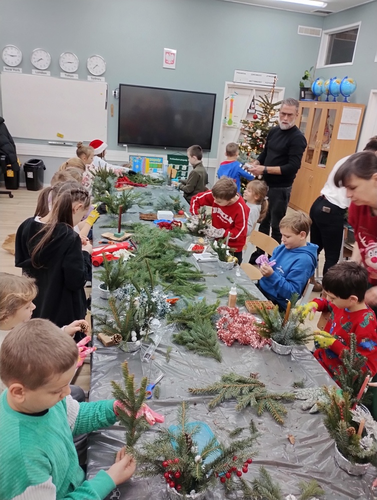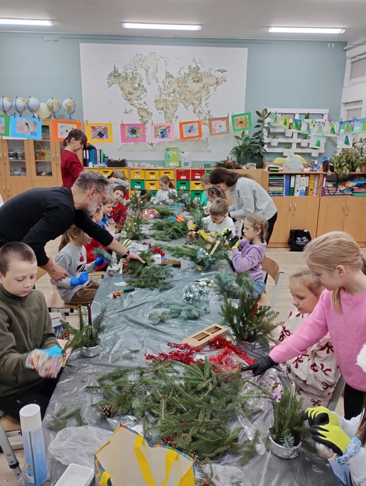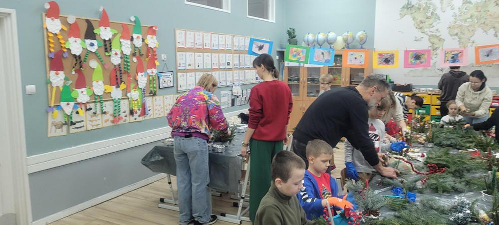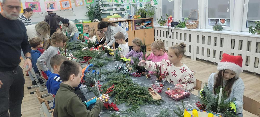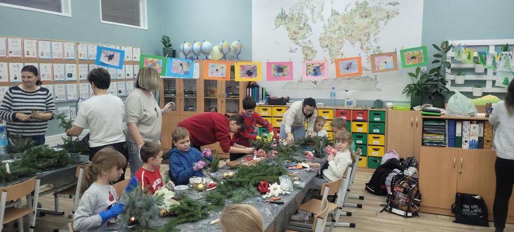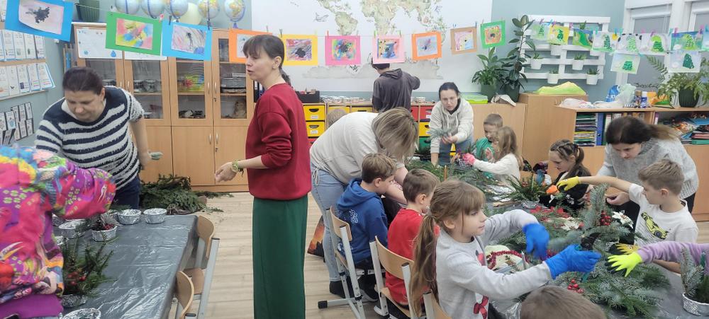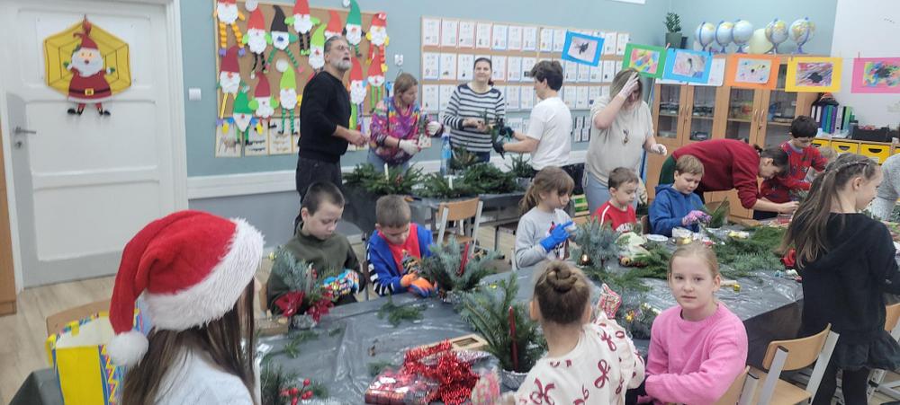 Dzieci, pod opieką nauczycielek i z pomocą chętnych rodziców, z entuzjazmem tworzyły świąteczne stroiki, wykorzystując naturalne ozdoby, kolorowe dodatki i swoją kreatywność. Praca uczniów była nie tylko okazją do rozwijania zdolności manualnych, ale przede wszystkim wyrazem solidarności i chęci niesienia pomocy.