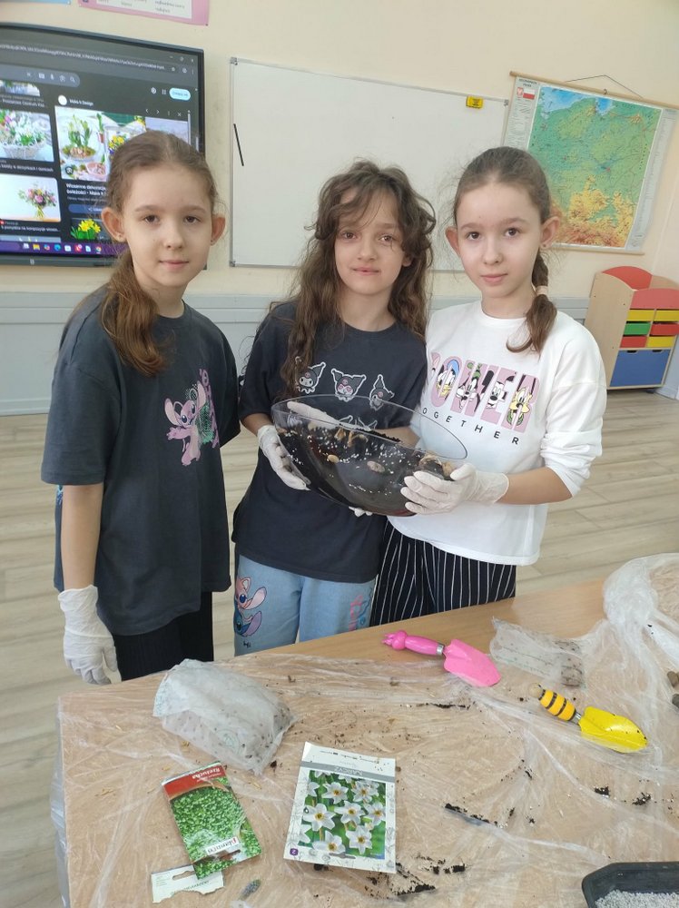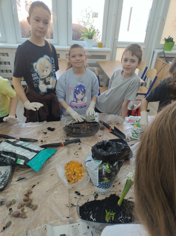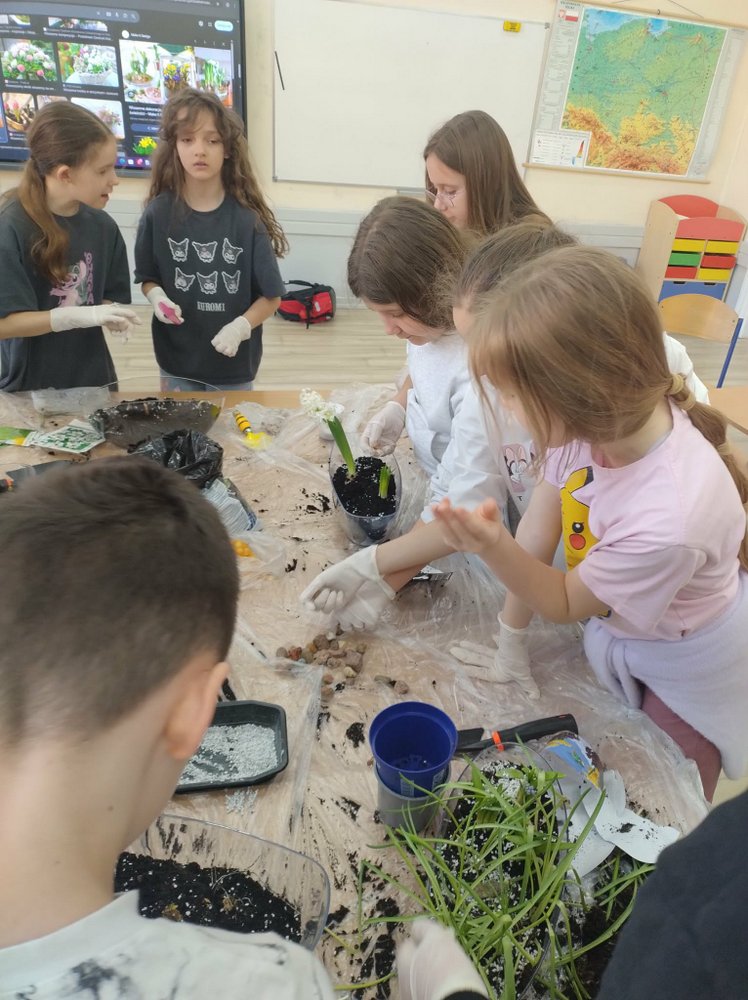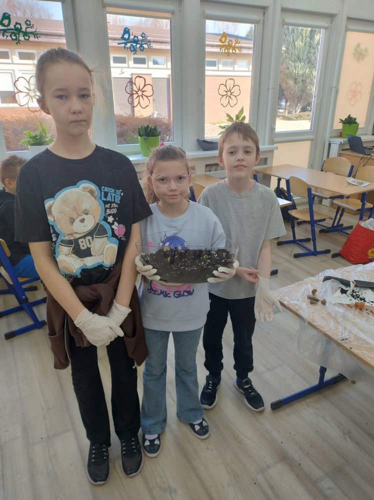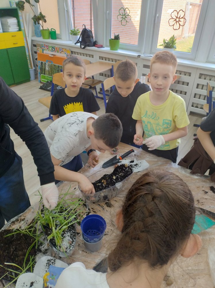 Dzieci zmieniły klasowy parapet w mały zielony ogródek. Uczniowie z wielkim zaangażowaniem wypełniali doniczki ziemią, sadzili cebulę, żonkile, hiacynty, szafirki oraz siali owies i rzeżuchę. Podlewali swoje roślinki. Była to doskonała okazja do rozmowy o tym, czego rośliny potrzebują do wzrostu - słońca, wody i ziemi. Dzieci z ciekawością obserwują zmiany zachodzące w naszym mini ogródku i z niecierpliwością czekają na pierwsze zielone listki i kwiaty. Dzięki takim działaniom uczą się odpowiedzialności, cierpliwości oraz poznają świat przyrody poprzez własne doświadczenia.