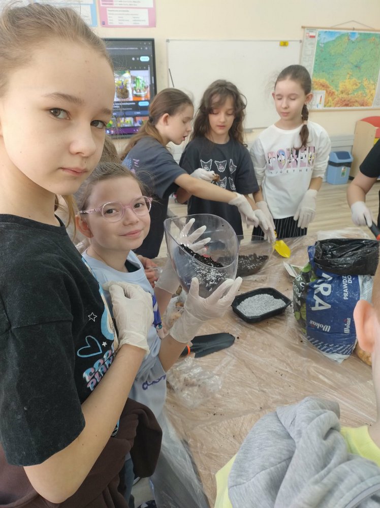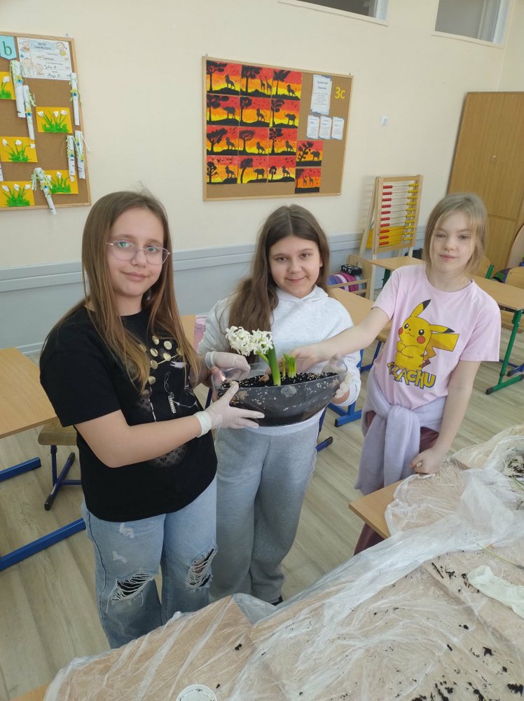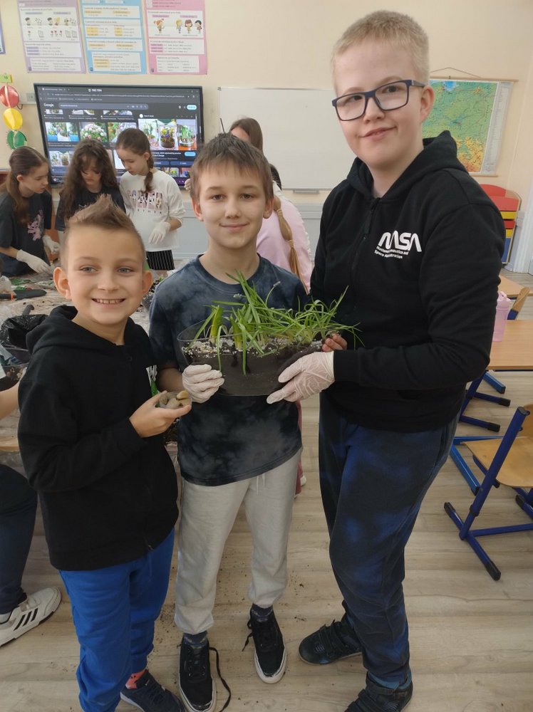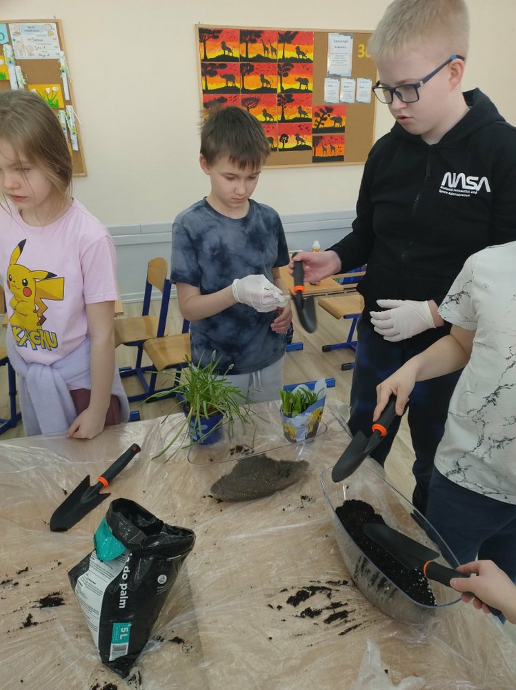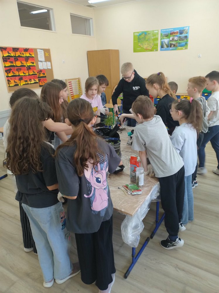 Dzieci zmieniły klasowy parapet w mały zielony ogródek. Uczniowie z wielkim zaangażowaniem wypełniali doniczki ziemią, sadzili cebulę, żonkile, hiacynty, szafirki oraz siali owies i rzeżuchę. Podlewali swoje roślinki. Była to doskonała okazja do rozmowy o tym, czego rośliny potrzebują do wzrostu - słońca, wody i ziemi. Dzieci z ciekawością obserwują zmiany zachodzące w naszym mini ogródku i z niecierpliwością czekają na pierwsze zielone listki i kwiaty. Dzięki takim działaniom uczą się odpowiedzialności, cierpliwości oraz poznają świat przyrody poprzez własne doświadczenia.